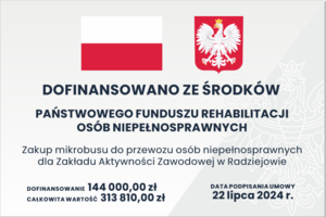 Zakup dofinansowany ze środków Państwowego Funduszu Rehabilitacji Osób Niepełnosprawnych w ramach „Programu wyrównywania różnic między regionami III” w obszarze D, projektu obejmującego: „Zakup mikrobusu do przewozu osób niepełnosprawnych dla Zakładu Aktywności Zawodowej w Radziejowie ”. Wartość dofinansowania 144.000,00 zł. Całkowita wartość zamówienia 313 810,00 zł.